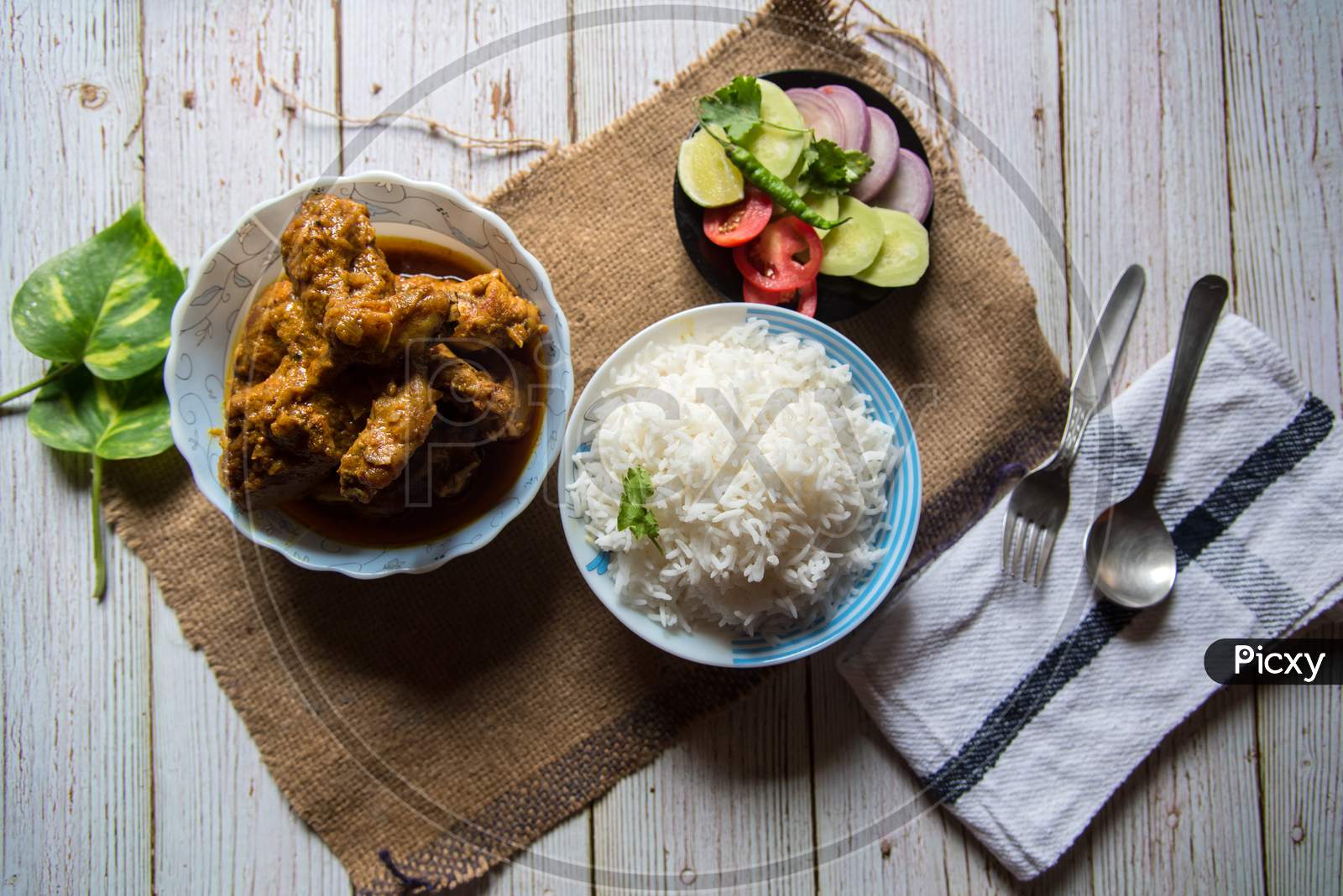Chicken curry cooked in home style with light gravy, Rice and green salad.