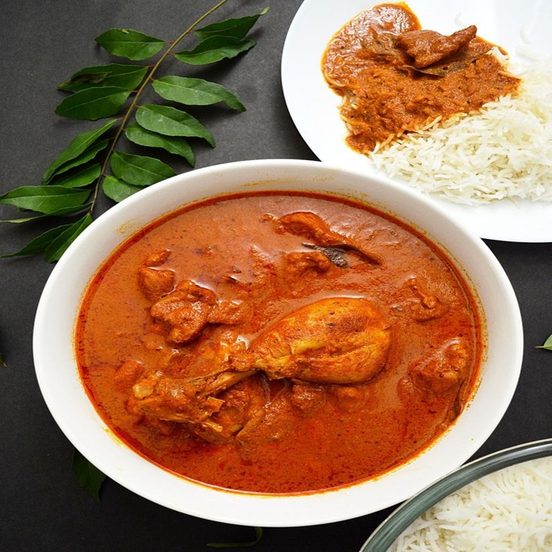 Creamy spicy Chicken Gassi served with fragrant ghee Rice creating a delicious balance of flavours that is both indulgent and satisfying