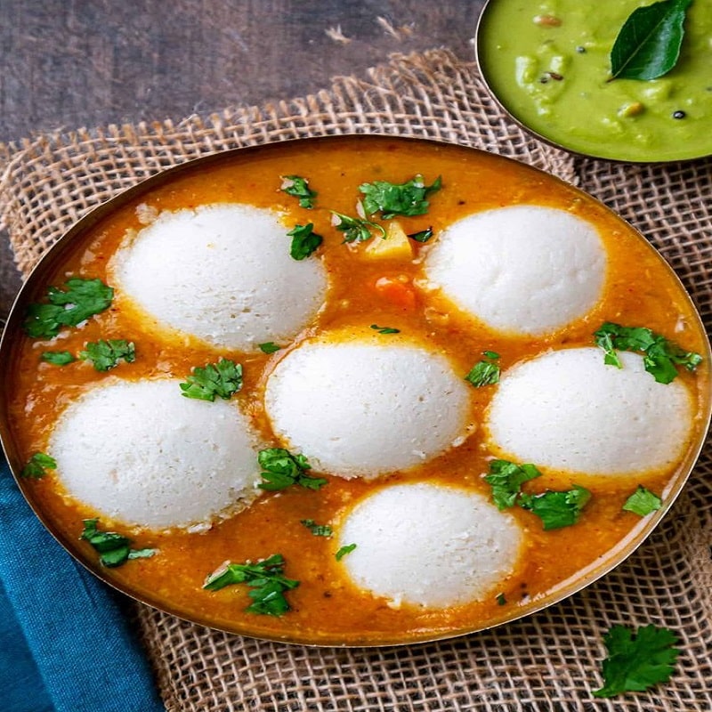 Idli with Sambar is a popular South Indian breakfast. Idli is a soft, steamed rice and urad dal (lentil) cake, known for its light texture. It is paired with sambar, a tangy, spiced lentil soup made with vegetables and tamarind.