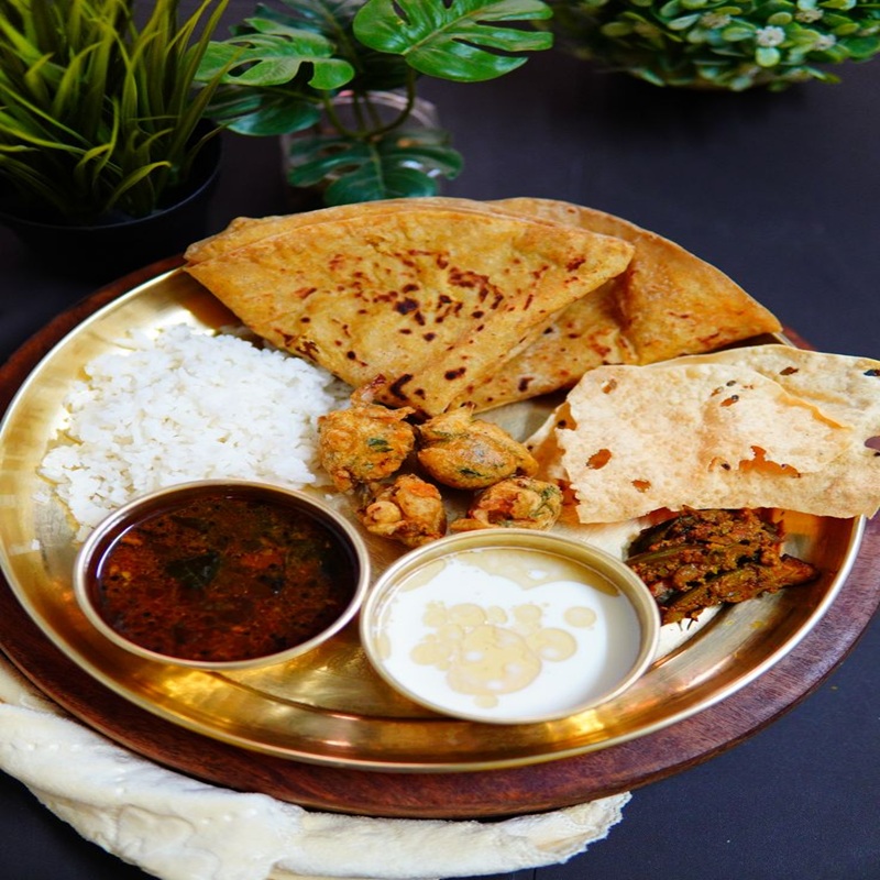 A comforting meal showcasing the blend of tangy, mildly spiced curries with soft rice and crunchy accompaniments.Finished with traditional sweets and refreshing sides, it reflects the homely warmth of Maharashtra.