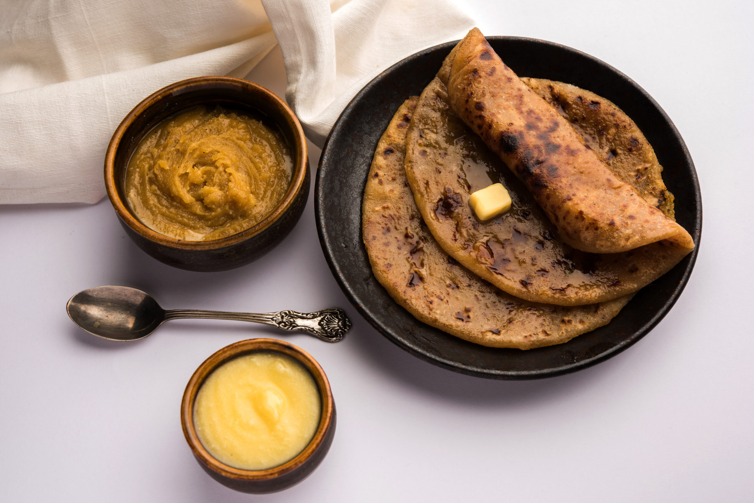 A sweet flatbread with a thin wheat dough embracing a luscious filling of sweetened lentils, sugar, and aromatic spices—a heavenly treat best enjoyed warm with a touch of ghee