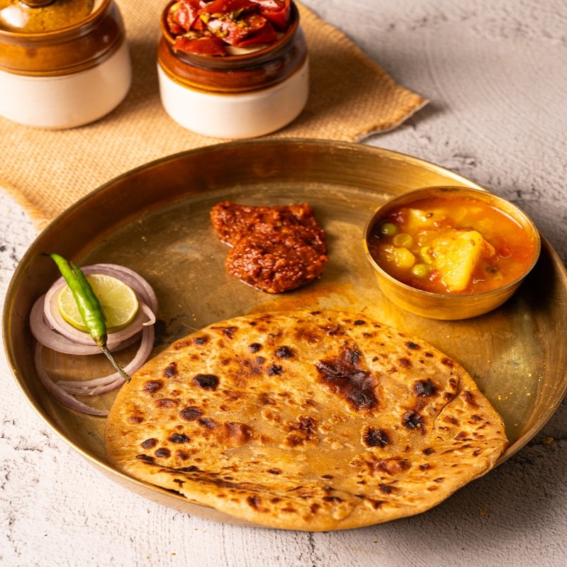 Healthy Indian flatbread stuffed with sattu and other simple ingredients and spices, 2 pieces served with dhania-Pudina chutney, Raita, Pickle