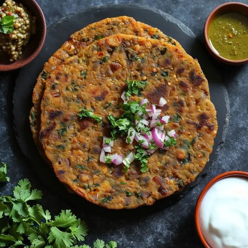 A wholesome multigrain flatbread made with roasted flours of wheat jowar bajra rice & besan mixed with onions cori&er & spices Served hot with butter curd or chutney it is a rustic & filling traditional breakfast or snack